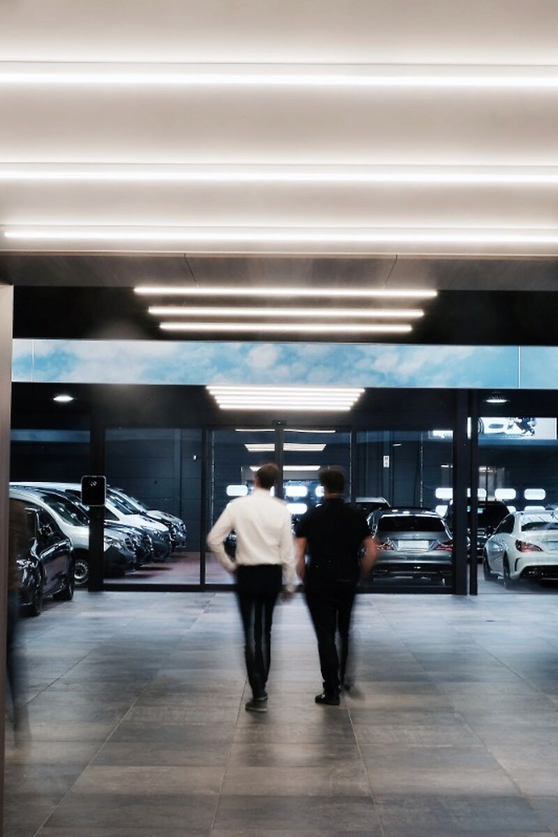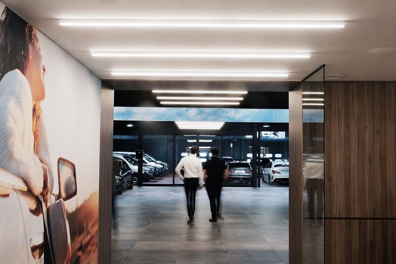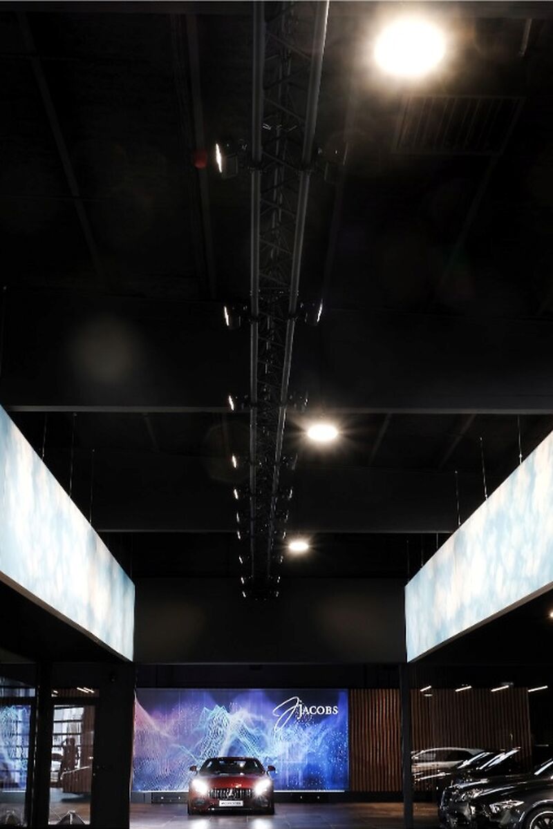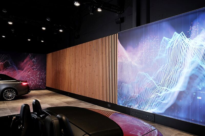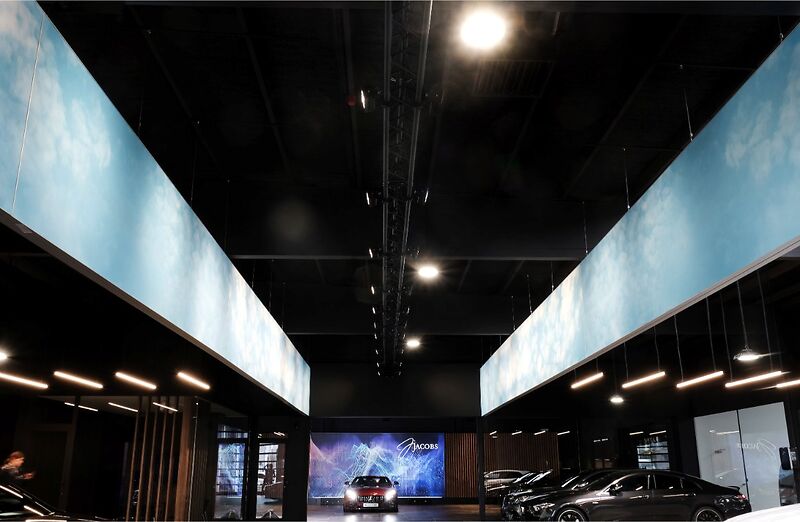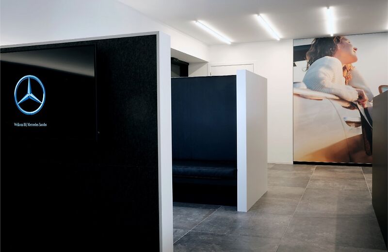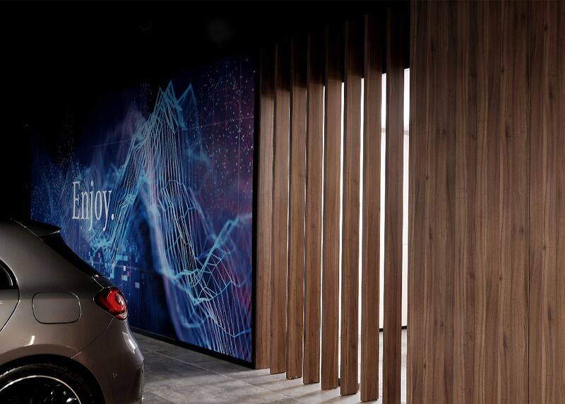 Door het gebruik van houten lamellen, bedrukte doeken en vilt werd een aangename akoestiek gerealiseerd, die het bezoek zacht en comfortabel maakt. De wagens staan volledig in de spotlight dankzij een zorgvuldig uitgewerkt lichtplan: een perfecte balans tussen functionele verlichting, indirect licht en warme, sfeervolle spots legt de nadruk op elk detail. Zo ontstaat een showroom waar design, comfort en de schoonheid van Mercedes samenkomen.