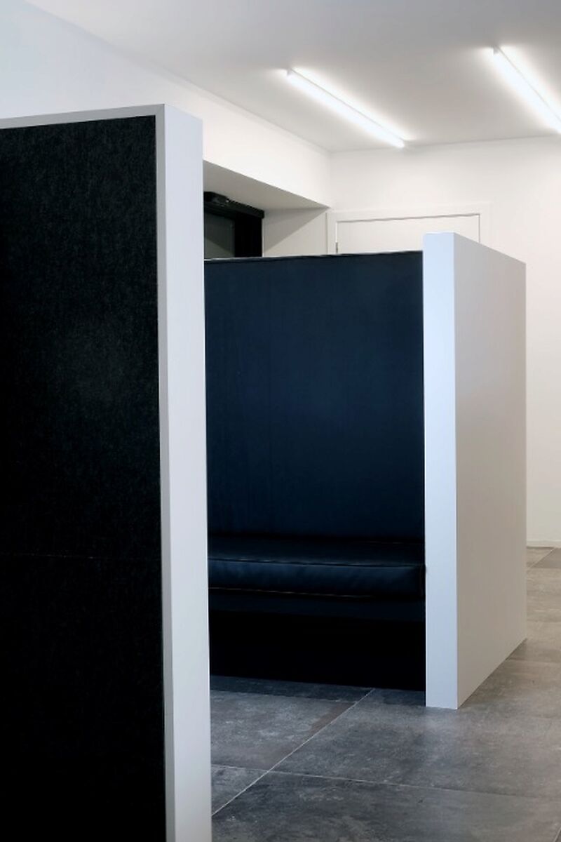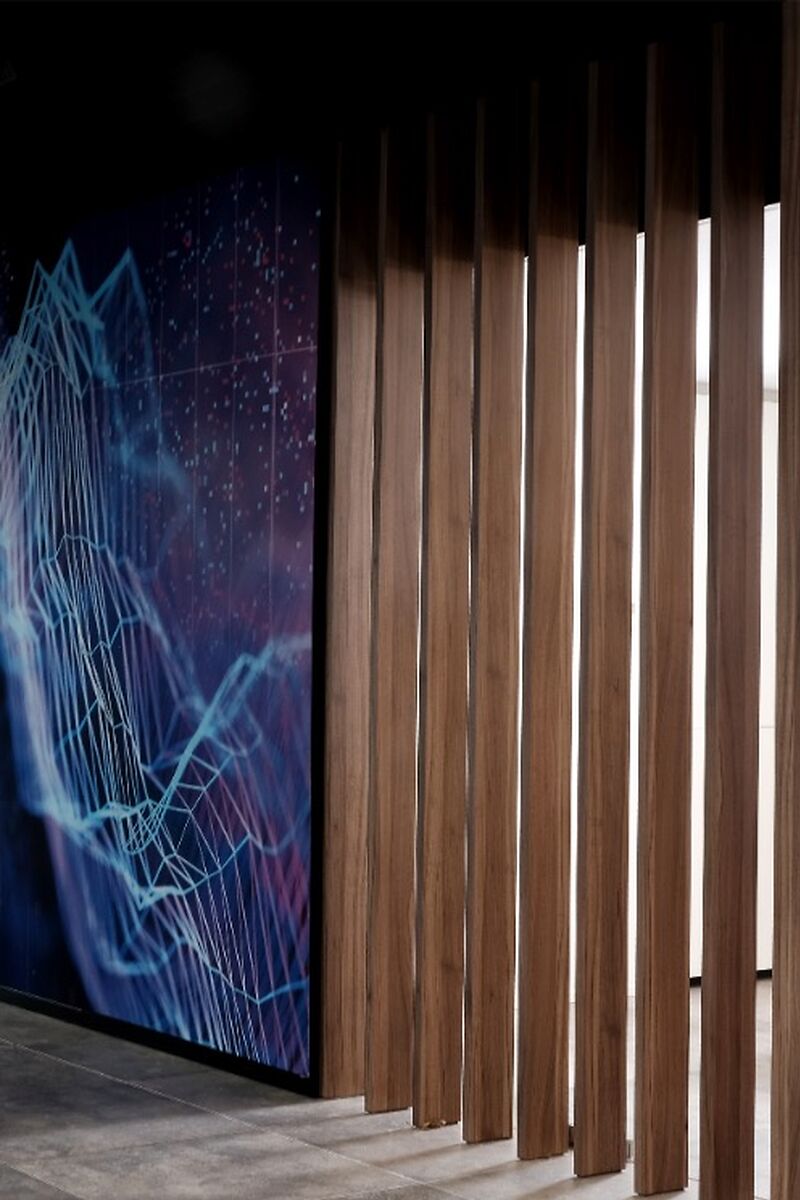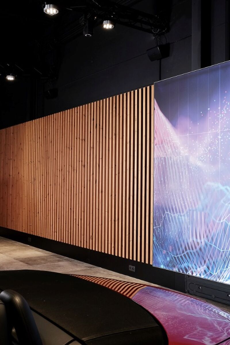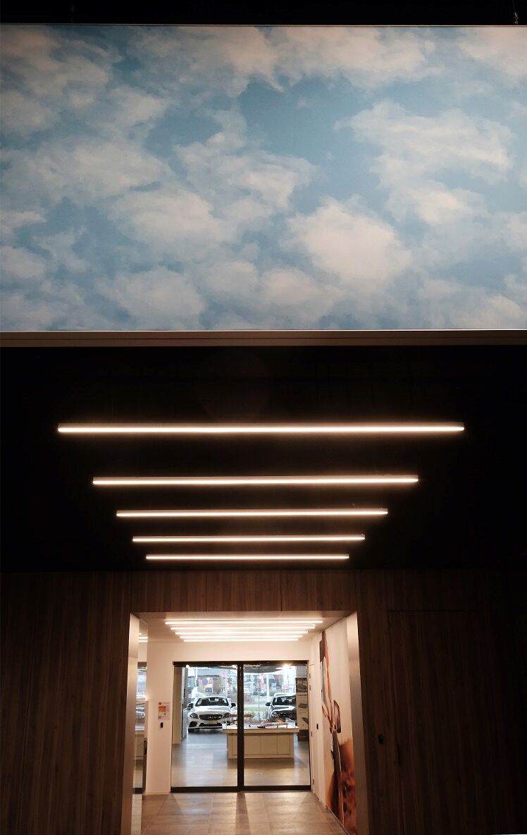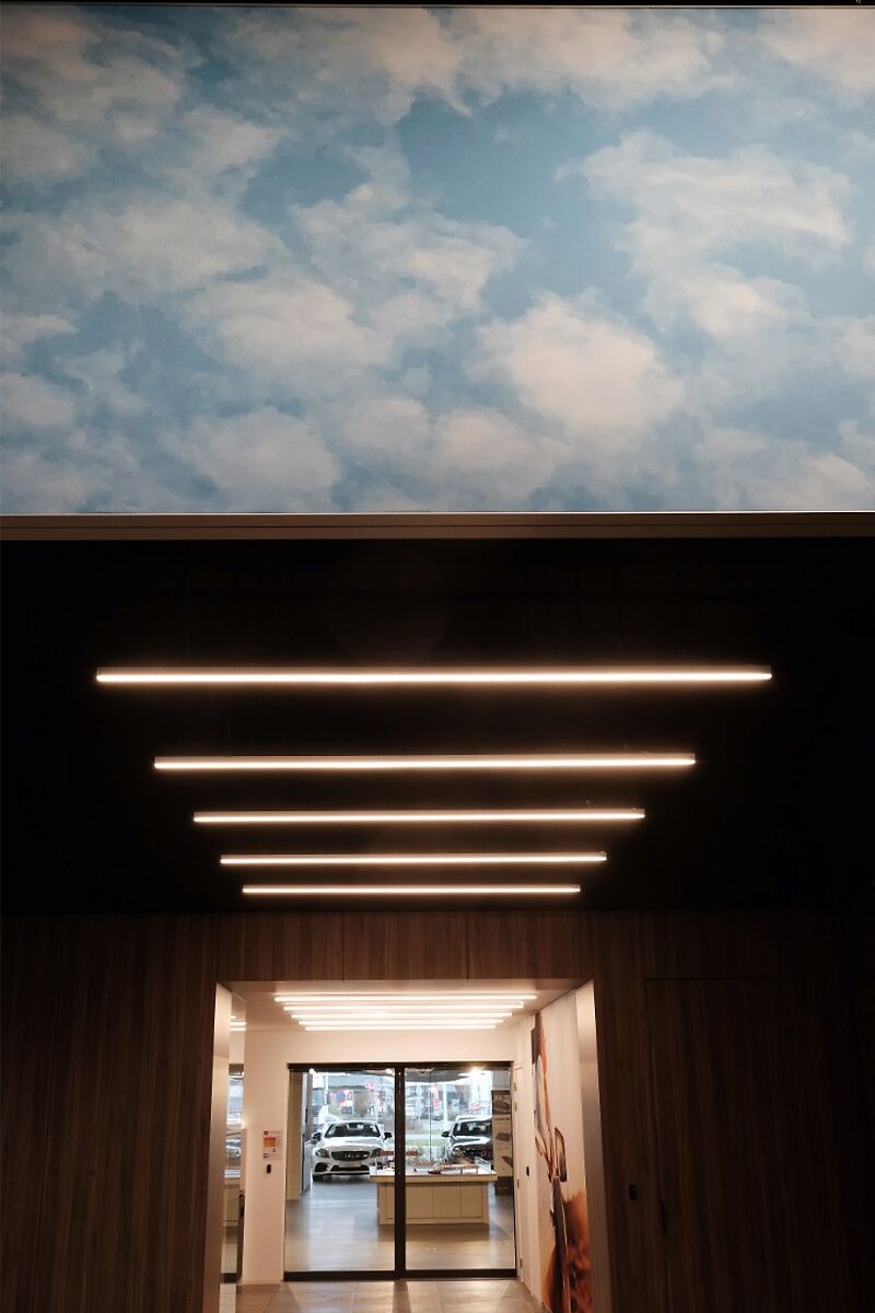 Door het gebruik van houten lamellen, bedrukte doeken en vilt werd een aangename akoestiek gerealiseerd, die het bezoek zacht en comfortabel maakt. De wagens staan volledig in de spotlight dankzij een zorgvuldig uitgewerkt lichtplan: een perfecte balans tussen functionele verlichting, indirect licht en warme, sfeervolle spots legt de nadruk op elk detail. Zo ontstaat een showroom waar design, comfort en de schoonheid van Mercedes samenkomen.