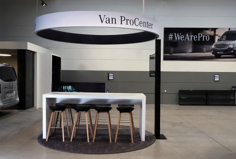 Bij de Mercedes-showroom creëerde Expo Experts een uitnodigende en stijlvolle beleving in een industrieel pand.