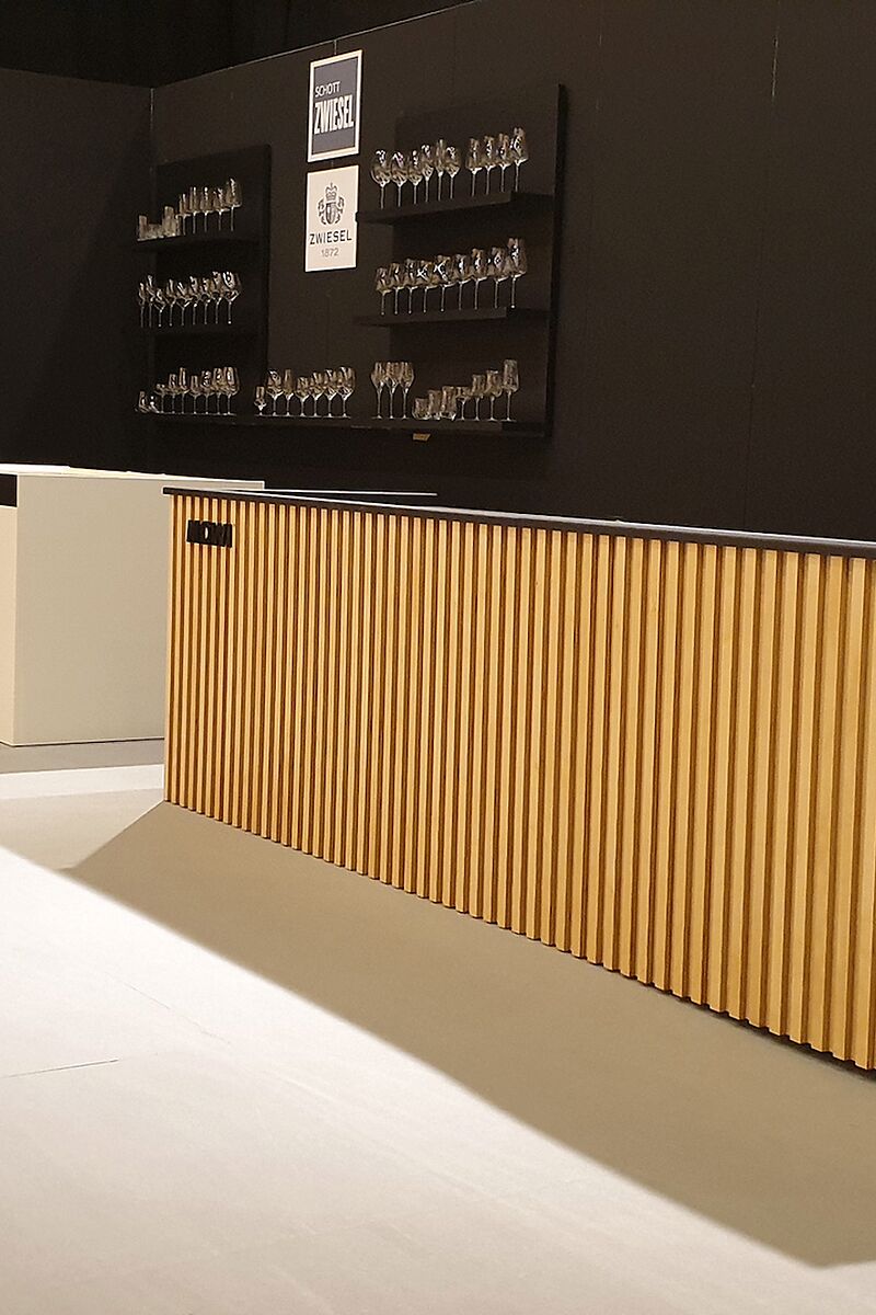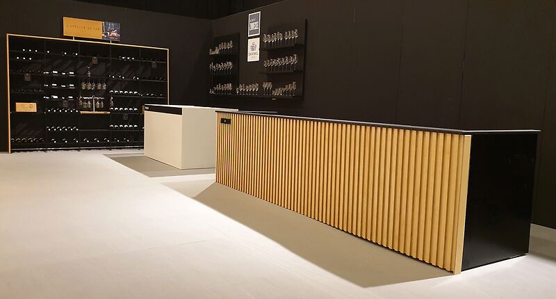 In het ontwerp voor deze beursstand van Mowi is er gebruik gemaakt van houten lattenwanden creëren we een warme, natuurlijke uitstraling en geven de stand een moderne, maritieme sfeer. Doeken worden gebruikt om ruimtes subtiel af te bakenen zonder het open karakter van de stand te verliezen. Zo ontstaan aparte zones voor demonstraties, ontmoetingen en gesprekken met partners en bezoekers. Een kookplaat is centraal geplaatst voor live demonstraties, waardoor bezoekers niet alleen kunnen zien, maar ook proeven hoe de producten van Mowi tot leven komen. Rondom de demonstratie zijn hoge barstoelen geplaatst, zodat gasten comfortabel kunnen zitten en de show van dichtbij kunnen volgen. Deze opstelling stimuleert interactie en maakt de beleving van het merk tastbaar. Door de slimme indeling en het gebruik van natuurlijke materialen, doeken en functionele meubels ontstaat een overzichtelijke stand waarin elk onderdeel van Mowi goed tot zijn recht komt. Bezoekers ervaren de producten, leren over duurzaamheid en innovatie, en krijgen een duidelijk beeld van het verhaal achter het merk. Kortom, de Mowi‑beursstand is meer dan een presentatieplek: het is een inspirerende omgeving waar kwaliteit, duurzaamheid en culinaire beleving samenkomen.