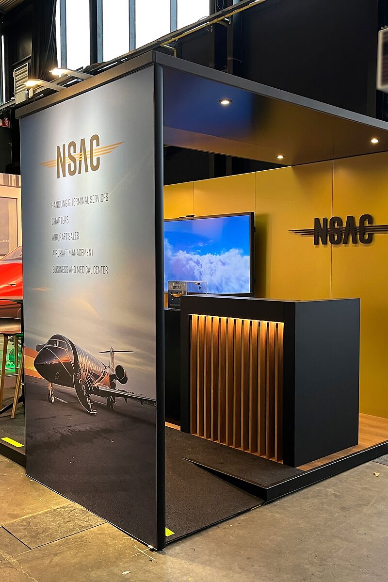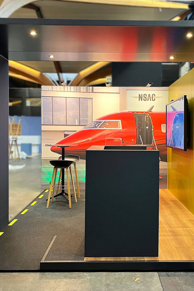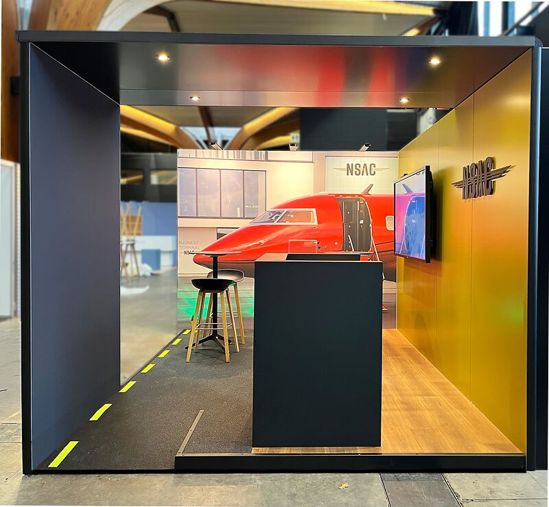 De beursstand van NSAC gaf bezoekers direct het gevoel op een luchthaven te zijn, waarbij belijning, belichting, plafonds en doeken zorgden voor structuur, herkenbaarheid en een overzichtelijke, uitnodigende ruimte om op een natuurlijke manier te ontdekken